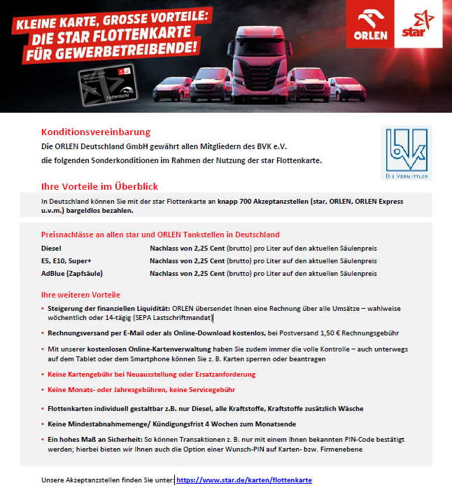 Seit dem 01.10.2005 besteht eine Kooperation zwischen der ORLEN Deutschland AG und der BVK-Dienstleistungs GmbH.