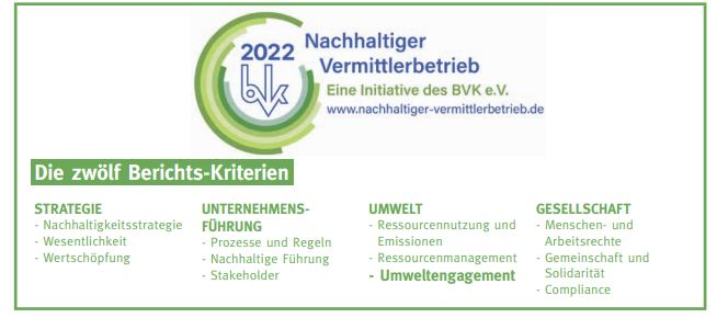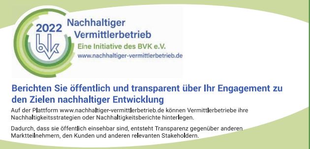 Wer seine Nachhaltigkeits-Strategie gegenüber der Öffentlichkeit durch Einstellung auf der Plattform www.nachhaltiger-vermittlerbetrieb.de“ überprüfbar macht, erhält vom BVK für ein Jahr ein entsprechendes Siegel verliehen.